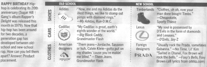 and new-school rap. How can you tell them apart? Answer: Product placement.